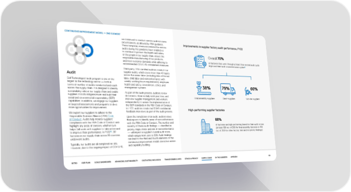 CONTINUOUS IMPROVEMENT MODEL — 2ND ELEMENT we continued to conduct remote audits in some circumstances, as allowed by RBA guidance. Improvements in supplier factory audit performance, FY22 These temporary measures initiated for remote audits during the pandemic have enabled us to continue to protect the health and safety Overall 70% of the people in our supply chain, assure the responsible manufacturing of our products, of factories that went through at least their second audit cycle and meet customer demands while adhering to 47 recommended COVID-19 containment measures. improved their audit scores between cycles Third-party, RBA-certified auditors conduct our Audit supplier audits, which cover more than 40 topics across five areas: labor (including risks of forced Dell Technologies’ audit program is one of the labor, child labor and nonconformance with largest in the technology sector — both in weekly working hours requirements); employee terms of number of audits conducted and reach health and safety; environment; ethics; and 38% 79% 66% across the supply chain. It is designed to identify management systems. sustainability risks in our supply chain and enable As part of the audit process, auditors review suppliers to both mitigate issues and build their documents, observe daily work practices, and social and environmental responsibility (SER) interview supplier management and workers Final assembly suppliers Direct suppliers Sub-tier suppliers capabilities. In addition, we engage our suppliers independently to assess the implementation of in targeted assessments and programs to drive the SER standards in the RBA Code of Conduct. more opportunities for improvement. In FY22, auditors conducted 12,641 confidential High-performing supplier factories We expect our suppliers to adhere to the feedback interviews as part of the audit process. Responsible Business Alliance (RBA) Code Upon the completion of an audit, auditors issue of Conduct. Audits help monitor suppliers’ final reports to identify areas of nonconformance 68% compliance with the RBA Code of Conduct and with the RBA Code of Conduct. The number and highlight any areas of concern, which in turn severity of these audit findings — classified as of factories are high performing based on their audit scores helps Dell work with suppliers to take action and priority, major, minor and risk of nonconformance (at least 180 out of 200 for final assembly factories or 160 to improve their performance. In FY2246, 317 — will impact a supplier’s overall audit score, out of 200 for other factory tiers and no priority findings) factories in our supply chain across 16 countries which ranges from zero to 200. Audit findings underwent audits. can lead to the third and fourth elements of the Typically, our audits are all completed on-site. continuous improvement model: corrective action However, due to the ongoing impact of COVID-19, and capability building. INTRO OUR PLAN GOALS DASHBOARD ADVANCING SUSTAINABILITY CULTIVATING INCLUSION TRANSFORMING LIVES ETHICS & PRIVACY SUPPLY CHAIN BY THE NUMBERS APPENDIX 108