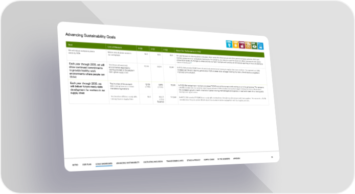 Advancing Sustainability Goals Goal Unit of Measure FY20 FY21 FY22 About Our Performance in FY22 We will reduce workplace plastic Metric tons of plastic waste in N/A N/A N/A Our goal focuses on reducing plastic and plastic foam waste from food service and other general workplace activities. With team waste by 90% our workplaces member presence at our workplaces impacted by the pandemic, any reduction reported would not reflect business-as-usual plastic consumption levels. As changes to where and how our team members work evolve, we will evaluate reporting on this or an alternative 13 metric in the future. Each year through 2030, we will Total hours of social and 41,733 61,124 61,587 In FY22, Dell provided 61,587 hours of social and environmental training to supply chain team members. This represents an 0.8% show continued commitments environmental responsibility increase over the prior reporting period and a 47.6% increase since we began tracking this metric. We attribute our progress to to provide healthy work training provided to the people in improved communication. Dell’s global supply chain environments where people can thrive Each year through 2030, we Total number of future-ready 12,723 6,592 13,045 In FY22, Dell-badged team members completed 13,045 hours of future-ready skills training at our in-house factories. This represents will deliver future-ready skills skills training hours at in-house (CY19) (CY20) a 97.9% increase over our previous reporting period and a 2.5% increase since we first began tracking this metric. We attribute development for workers in our manufacturing locations this increase to growth in both virtual and in-person training methodologies and expansion in reach and impact of our training skills development opportunities. supply chain Total number of future-ready skills N/A 99,271 144,658 In FY22, Dell recorded 144,658 future-ready skills training hours through our pilot program with two suppliers. This represents a 45.7% training hours in supply chain (CY20 increase over the prior period. We attribute this increase to better engagement with our supplier partners. Baseline) INTRO OUR PLAN GOALS DASHBOARD ADVANCING SUSTAINABILITY CULTIVATING INCLUSION TRANSFORMING LIVES ETHICS & PRIVACY SUPPLY CHAIN BY THE NUMBERS APPENDIX 29