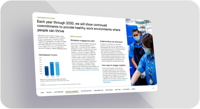 CHAMPIONING PEOPLE GOALS Each year through 2030, we will show continued commitments to provide healthy work environments where people can thrive Dell expects a safe, healthy workplace where RECENT HIGHLIGHTS people can thrive. Delivering such a workplace involves a commitment to health and safety, Workplace engagement pilot Implementing new processes training, and management. We expect the same within our supply chain, and we reinforce the Worked with Social Accountability International Continued our commitment to the health responsible operation of our factories and those (SAI) to pilot its TenSquared program in our and safety of everyone in our supply chain by of our suppliers. We evolve our approach to supply chain. A structured, 100-day workplace prioritizing high-risk manufacturing processes. We ensure we continue to deliver meaningful impact. engagement program, TenSquared united teams implemented a hierarchy of control for processes, of supplier employees and their managers to such as aluminum-magnesium smelting, address root causes of workplace challenges, electroplating, painting and solvent cleaning. overcome institutional hurdles to change and Processes include elimination and substitution, as PERFORMANCE TO DATE* create a culture of continuous improvement. well as engineering and administrative controls. Frontline supplier employees participated in We also assessed supplier management systems, 80,000 machine safeguarding, process operation and the process of root cause analysis, solution 70,000 discussion, execution progress evaluation and material management for high-risk processes. 60,000 61,587 impact measurement. Participants learned 61,124 50,000 a robust methodology for problem-solving, New ways to engage suppliers 40,000 41,733 organizational communication and leadership that 30,000 they can apply to future challenges. Learn more Partnered with suppliers to increase their about the TenSquared program in this case study. own health and safety practices, facilitating 20,000 workshops and developing a short video series 10,000 focused on chemical safety and wearing proper 0 personal protective equipment (PPE). This series 2019 24 2020 25 FY22 is available on Dell’s mobile training platform, Total hours of social and environmental responsibility making it easy for workers to access. Learn more training provided to the people in Dell's global supply chain about how we enable digital learning through mobile phones. *Please see our 2030 Goals Dashboard for more on the progress, scope and measurement of this goal. INTRO OUR PLAN GOALS DASHBOARD ADVANCING SUSTAINABILITY CULTIVATING INCLUSION TRANSFORMING LIVES ETHICS & PRIVACY SUPPLY CHAIN BY THE NUMBERS APPENDIX 58