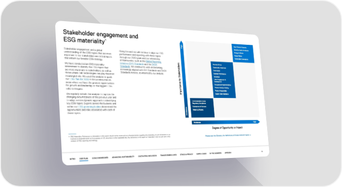Stakeholder engagement and * ESG materiality Stakeholder engagement and a global Going forward we will continue to align our ESG understanding of the ESG topics that are most performance and reporting with these topics important to our stakeholders are critical inputs through our 2030 goals and our referencing that inform our broader ESG strategy. of frameworks, such as the Global Reporting We have conducted an ESG materiality Initiative (GRI) Standards and the SASB assessment to identify the ESG topics that Standards. We continue to work on becoming are most important to stakeholders, as well as increasingly aligned with GRI Standards and SASB those where Dell Technologies can play the most Standards metrics, as informed by our analysis. meaningful role. We used this analysis to guide our ESG Plan for 2030 to focus resources on areas where we have the greatest opportunities for growth and leadership or the biggest ESG risks to mitigate. We regularly refresh this analysis to capture the changing circumstances of the previous year and to adopt a more dynamic approach to identifying key ESG topics. Experts across the business and within our ESG governing bodies determined the opportunities and risks associated with each of these topics. * ESG Materiality: References to information in this report should not be construed as a characterization regarding the materiality of such information to our business or financial results or for purposes of U.S. securities or other applicable law. Any references in this report to “materiality” refer to such term in the Please see the Glossary for definitions of these material topics → context of ESG reporting and strategy. INTRO OUR PLAN GOALS DASHBOARD ADVANCING SUSTAINABILITY CULTIVATING INCLUSION TRANSFORMING LIVES ETHICS & PRIVACY SUPPLY CHAIN BY THE NUMBERS APPENDIX 14