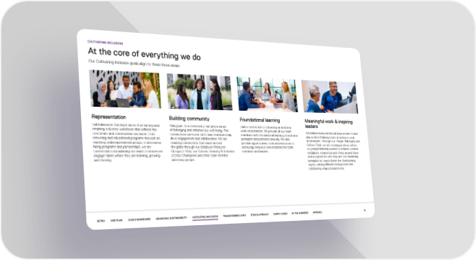 CULTIVATING INCLUSION At the core of everything we do Our Cultivating Inclusion goals align to these focus areas: Representation Building community Foundational learning Meaningful work & inspiring Dell believes in the importance of attracting and Being part of a community can give a sense Dell is committed to cultivating an inclusive leaders retaining a diverse workforce that reflects the of belonging and enhance our well-being. The work environment. We provide all our team We believe everyone should have access to and customers and communities we serve. From connections we foster with team members help members with foundational learning on inclusive play a role in helping create an inclusive work recruiting and educational programs focused on drive engagement and collaboration. We are principles and practices annually. We also environment. Through our People Philosophy and reaching underrepresented groups, to innovative creating connections that reach around provide opportunities, tools and resources to Culture Code, we are creating a culture where hiring programs and partnerships, we are the globe through our Employee Resource encourage inclusive conversations for team our people feel empowered to achieve, a sense committed to broadening our reach to ensure we Groups (ERGs), our Culture, Diversity & Inclusion members and leaders. of balance, connected with those around them engage talent where they are learning, growing (CD&I) Champions and other team member and accepted for who they are. Our leadership and thriving. advocacy groups. principles set expectations for championing equity, valuing different backgrounds and celebrating unique perspectives. INTRO OUR PLAN GOALS DASHBOARD ADVANCING SUSTAINABILITY CULTIVATING INCLUSION TRANSFORMING LIVES ETHICS & PRIVACY SUPPLY CHAIN BY THE NUMBERS APPENDIX 70