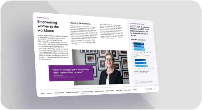 REPRESENTATION CULTIVATING INCLUSION GOAL Empowering Rejoining the workforce Dell’s Career ReStart Returnship Program By 2030, 50% of our global gave her that chance. This 16-week program workforce and 40% of our Sandra Norris had a 20-year career in program matches candidates with roles that build on women in the and project management with Fortune 500 their core talents, training for new skills as global people leaders will clients before stepping away to take care of her needed and mentors to support them at every be those who identify as workforce family and moving around Europe and the U.S. in step. Career ReStart helps fill the talent gap women support of her husband’s career. Seventeen years with more experienced team members whose later, Sandra’s world had changed. She was no fundamental skill sets make them invaluable Expanding our professional hiring programs longer married and taking care of young children. additions to their teams. PERFORMANCE TO DATE* is imperative to reaching our moonshot Wanting more for herself, Sandra decided to goals. We have the Career ReStart rejoin the workforce but struggled to find an organization that could see past her 17-year FY20 31.1% Returnship Program for people who have career gap. had a career gap, along with opportunities FY21 31.8% to refresh job skills and participate in FY22 33.9% structured onboarding. Though not limited to women, these programs recognize the 0% 10% 20% 30% 40% 50% unique challenges women have historically Percentage of global workforce who identify faced as primary caregivers, as well as the as women impact of the recent pandemic on women in the workforce. FY20 24.4% FY21 25.8% FY22 28.2% “I knew if I could just get to the interview 0% 5% 10% 15% 20% 25% 30% 35% 40% stage, they would see my value.” Percentage of people leaders in global workforce who identify as women SANDRA NORRIS PROJECT MANAGER (NORTH AMERICA) * Please see our 2030 Goals Dashboard for more on the progress, scope and measurement of this goal. INTRO OUR PLAN GOALS DASHBOARD ADVANCING SUSTAINABILITY CULTIVATING INCLUSION TRANSFORMING LIVES ETHICS & PRIVACY SUPPLY CHAIN BY THE NUMBERS APPENDIX DELL TECHNOLOGIES 73 FY22 ESG REPORT