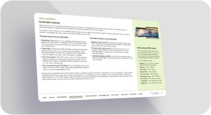 PRODUCT SUSTAINABILITY Sustainable materials Dell prioritizes the use of recycled and renewable materials in both products and packaging. Recycled and renewable materials can dramatically reduce the environmental impact of manufacturing when compared to the emissions generated to create new materials. Our extensive work to scale our use of sustainable materials means we are not reliant on one material or supplier to reach our goal to have 50% of our products and 100% of packaging made with recycled or renewable materials by the year 2030. Recycled material we are using today: Renewable materials we are using today: • Closed-loop: Taking back out-of-use technology and recycling materials to • Bioplastics made with tall oil: A by-product of the paper-making process, make parts for new devices. For example, in 2021 OptiPlex became the first tall oil37 is mixed with other new and recycled materials for use in the lids of PCs to use hard drives made with closed-loop recycled aluminum sourced Latitude 5000 and Precision 3000 notebooks. Dell Latitude 5000 series 36 from old disk drives. 38 • Bio-based rubber using castor oil: A nonfood crop, castor oil is used • Carbon fiber: Recycling carbon fiber materials sourced from the aerospace to create a rubber material for the bottom bumpers on new Latitude The new Dell Latitude 5000 series products and other industries for use in our products. This thermoplastic carbon 5000/7000/9000 series laptops and in Precision 3000 series mobile are made with the industry’s most innovative fiber-based material can be ground up, remelted back into thermoplastic workstations laptops. use of sustainable materials in mainstream resin and molded into new parts, while maintaining its recyclability. • Renewable packaging materials: Recycled corrugate and paper, bamboo, business laptops with recycled, reclaimed and • Ocean-bound plastic: Since 2017, we have used over 443,000 pounds of and most recently, bagasse, a sugar cane byproduct, are materials we use in renewable materials throughout the chassis. ocean-bound plastics in our packaging. We recently extended use of this select packaging. List of sustainable materials: material in select Latitude, Precision and OptiPlex products, as well as our EcoLoop™ line of carrying cases. • Laptop lid – 71% PCR plastic, reclaimed 39 • Post-consumer Recycled (PCR) Plastic: We use PCR plastic made from a carbon fiber and bio-based plastic variety of sources, such as 5-gallon water cooler jugs and single use plastics • Palm rest – 35% PCR plastic across our product and packaging portfolio. • Inner frame – 35% PCR plastic We also look for materials that have as little carbon footprint as possible in production, assembly or transportation. Our work with aluminum is a great example. • Battery frame – 50% PCR plastic Traditionally, aluminum has a high carbon footprint due in large part to the smelting process, which typically occurs in coal-powered facilities. To help reduce • LCD cover frame – 30% PCR plastic carbon footprint, our XPS 13 Plus chassis is made with aluminum produced with hydropower. This chassis offers a 70% reduction in carbon emissions versus a • AC adapter exterior – 30% PCR plastic coal–powered chassis. We will extend this material to additional product lines in 2022. • Fan-housing – 28% ocean-bound plastic • Laptop base – 20% reclaimed carbon fiber • Rubber feet – up to 39% bio-based rubber INTRO OUR PLAN GOALS DASHBOARD ADVANCING SUSTAINABILITY CULTIVATING INCLUSION TRANSFORMING LIVES ETHICS & PRIVACY SUPPLY CHAIN BY THE NUMBERS APPENDIX DELL TECHNOLOGIES 65 FY22 ESG REPORT