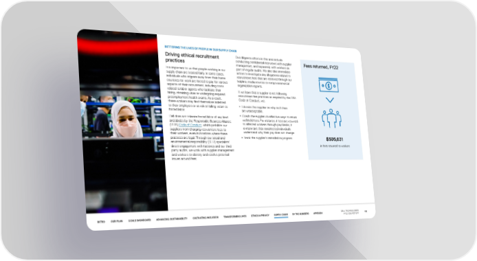 BETTERING THE LIVES OF PEOPLE IN OUR SUPPLY CHAIN Driving ethical recruitment Due diligence efforts in this area include practices conducting confidential interviews with supplier Fees returned, FY22 management, and separately with workers as It is important to us that people working in our part of regular audits. We also take immediate supply chain are treated fairly. In some cases, action to investigate any allegations related to individuals who migrate away from their home recruitment fees that are received through our countries for work are forced to pay for various helpline, media sources or nongovernmental aspects of their recruitment, including costs organization reports. related to labor agents who facilitate their If we learn that a supplier is not following hiring, obtaining visas or undergoing required recruitment fee practices as required by the RBA preemployment health exams. As a result, Code of Conduct, we: these workers may find themselves indebted to their employers or at risk of falling victim to • Educate the supplier on why such fees forced labor. are unacceptable. Dell does not tolerate forced labor of any kind • Coach the supplier on effective ways to return and abides by the Responsible Business Alliance withheld fees. For instance, if fees are returned (RBA) Code of Conduct, which prohibits our to affected workers through paychecks, it suppliers from charging recruitment fees to is important that nonaffected individuals their workers, even in locations where these understand why their pay does not change. practices are legal. Through our social and • Track the supplier’s remediation progress. $505,031 environmental responsibility (SER) specialists’ direct engagement with factories and our third- in fees returned to workers party audits, we work with supplier management and workers to identify and resolve potential issues around fees. INTRO OUR PLAN GOALS DASHBOARD ADVANCING SUSTAINABILITY CULTIVATING INCLUSION TRANSFORMING LIVES ETHICS & PRIVACY SUPPLY CHAIN BY THE NUMBERS APPENDIX DELL TECHNOLOGIES 116 FY22 ESG REPORT