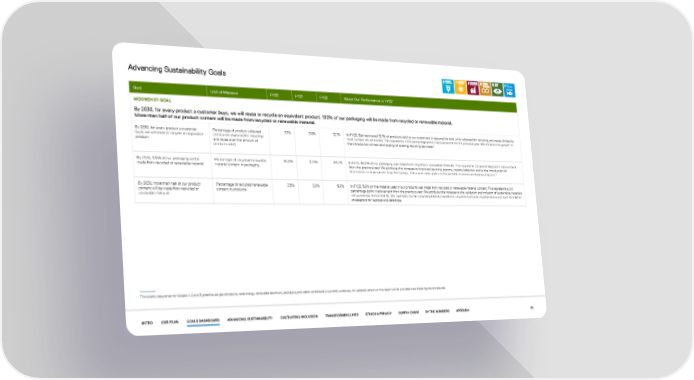 Advancing Sustainability Goals Goal Unit of Measure FY20 FY21 FY22 About Our Performance in FY22 MOONSHOT GOAL By 2030, for every product a customer buys, we will reuse or recycle an equivalent product. 100% of our packaging will be made from recycled or renewable material. More than half of our product content will be made from recycled or renewable material. By 2030, for every product a customer Percentage of product collected 9.1% 9.6% 12.1% In FY22, Dell recovered 12.1% of products sold to our customers (measured as total units collected for recycling and reuse, divided by buys, we will reuse or recycle an equivalent (total units captured for recycling total number of units sold). This represents a 2.5 percentage point improvement from the previous year. We attribute the growth to 3 product and reuse over the amount of the introduction of new and scaling of existing recycling services. products sold) By 2030, 100% of our packaging will be Percentage of recycled/renewable 85.0% 87.0% 90.2% In FY22, 90.2% of our packaging was made from recycled or renewable materials. This represents 3.2 percentage point improvement made from recycled or renewable material material content in packaging from the previous year. We attribute this increase to improved sourcing options, material selection and to the introduction of alternatives to virgin plastic bags for laptops. This metric only applies to known Dell customer packaging programs.4 By 2030, more than half of our product Percentage of recycled/renewable 3.5% 3.9% 5.9% In FY22, 5.9% of the material used in our products was made from recycled or renewable material content. This represents a 2.0 content will be made from recycled or content in products percentage point improvement from the previous year. We attribute this increase to the validation and inclusion of sustainable materials renewable material not previously accounted for (for example, certain recycled plastics, bioplastics, recycled steel and recycled aluminum) and the addition of adaptors for laptops and desktops. Third-party assurance for Scopes 1, 2 and 3 greenhouse gas emissions, total energy, renewable electricity, packaging and water withdrawal is currently underway. An updated version of this report will be provided once these figures are assured. INTRO OUR PLAN GOALS DASHBOARD ADVANCING SUSTAINABILITY CULTIVATING INCLUSION TRANSFORMING LIVES ETHICS & PRIVACY SUPPLY CHAIN BY THE NUMBERS APPENDIX 26