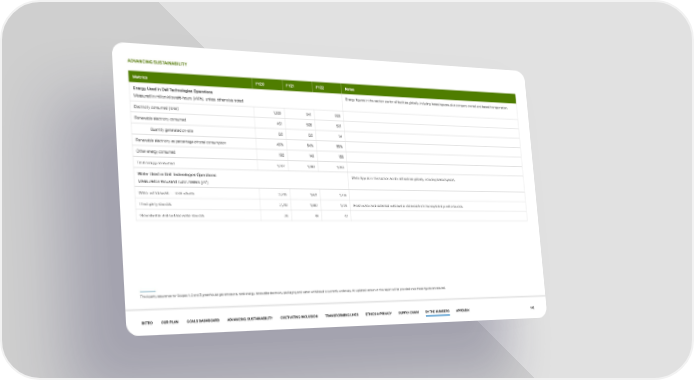 ADVANCING SUSTAINABILITY Metrics FY20 FY21 FY22 Notes Energy Used in Dell Technologies Operations Energy figures in this section are for all facilities globally, including leased spaces, plus company owned and leased transportation. Measured in million kilowatt-hours (kWh), unless otherwise noted Electricity consumed (total) 1,009 941 909 Renewable electricity consumed 461 508 501 Quantity generated on-site 0.8 0.8 1.4 Renewable electricity as percentage of total consumption 46% 54% 55% Other energy consumed 198 149 155 Total energy consumed 1,207 1,090 1,063 Water Used in Dell Technologies Operations Water figures in this section are for all facilities globally, including leased spaces. 3 Measured in thousand cubic meters (m ) Water withdrawals — total volume 2,346 1,931 1,778 Third-party sources 2,310 1,882 1,736 Fresh water and reclaimed wastewater obtained from municipal and private sources. Groundwater and surface water sources 36 49 42 Third-party assurance for Scopes 1, 2 and 3 greenhouse gas emissions, total energy, renewable electricity, packaging and water withdrawal is currently underway. An updated version of this report will be provided once these figures are assured. INTRO OUR PLAN GOALS DASHBOARD ADVANCING SUSTAINABILITY CULTIVATING INCLUSION TRANSFORMING LIVES ETHICS & PRIVACY SUPPLY CHAIN BY THE NUMBERS APPENDIX 142