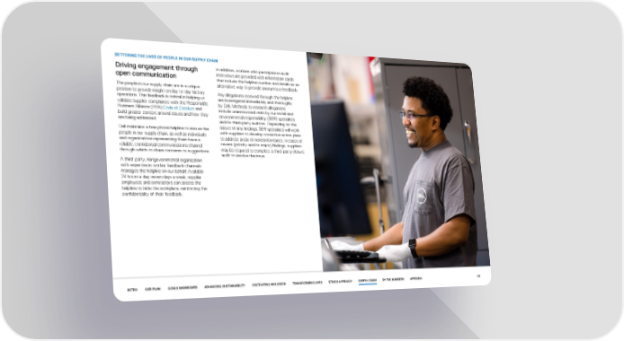 BETTERING THE LIVES OF PEOPLE IN OUR SUPPLY CHAIN Driving engagement through In addition, workers who participate in audit open communication interviews are provided with information cards that include the helpline number and details as an The people in our supply chain are in a unique alternative way to provide anonymous feedback. position to provide insight on day-to-day factory Any allegations received through the helpline operations. This feedback is critical in helping us are investigated immediately and thoroughly validate supplier compliance with the Responsible by Dell. Methods to research allegations Business Alliance (RBA) Code of Conduct and include unannounced visits by our social and build greater context around issues and how they environmental responsibility (SER) specialists are being addressed. and/or third-party auditors. Depending on the Dell maintains a free phone helpline to ensure the nature of any findings, SER specialists will work people in our supply chain, as well as individuals with suppliers to develop corrective action plans and organizations representing them have a to address areas of nonconformance. In cases of reliable, confidential communications channel severe (priority and/or major) findings, suppliers through which to share concerns or suggestions. may be required to complete a third-party closure audit to resolve the issue. A third-party, nongovernmental organization with expertise in worker feedback channels manages the helpline on our behalf. Available 24 hours a day, seven days a week, supplier employees and contractors can access the helpline outside the workplace, reinforcing the confidentiality of their feedback. INTRO OUR PLAN GOALS DASHBOARD ADVANCING SUSTAINABILITY CULTIVATING INCLUSION TRANSFORMING LIVES ETHICS & PRIVACY SUPPLY CHAIN BY THE NUMBERS APPENDIX 122