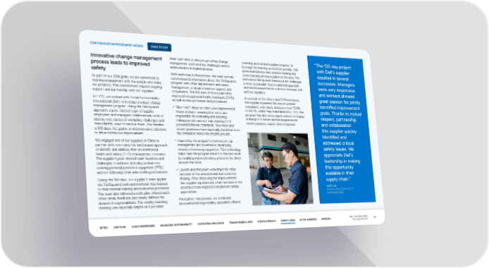 CONTINUOUS IMPROVEMENT MODEL CASE STUDY Innovative change management them with time to discuss upcoming change coaching and tracked supplier progress. To “The 100-day project process leads to improved management work and any challenges and/or leverage the learning as much as possible, Dell with Dell’s supplier achievements in implementation. promoted industry best practice sharing and resulted in several safety With each step in the process, the team actively cross-learning among suppliers in the area. The communicated information about the TenSquared innovative TenSquared framework for challenges successes. Managers As part of our ESG goals, we are committed to is more sustainable than a traditional approach ongoing engagement with the people who make program with other departments and senior and has increased the mutual trust between Dell were very responsive our products. This commitment requires ongoing management to obtain maximum support and and our suppliers. and workers showed support and partnership with our suppliers. cooperation. The 100 days of focus paid off in improved occupational health standards (OHS), As a result of the efforts and OHS innovation, great passion for jointly In FY22, we worked with Social Accountability as well as new processes and procedures: the supplier increased the rate of workers’ identified improvement International (SAI) to leverage a unique change compliance with safety behaviors from 79.0% management program. Using the TenSquared • “Blue Vest” observer roles were implemented. to 95.2%, which they maintained into FY23. The goals. Thanks to mutual approach, a peer-elected team of supplier These workers, wearing blue vests, are program has also encouraged workers to engage employees and managers collaboratively work to responsible for reminding and assisting in fixing OHS issues and has inspired more respect, partnership identify root causes of workplace challenges and colleagues who are not fully meeting OHS communication, respect and recognition. and collaboration then identify ways to resolve them. The timeline personal behavior standards. New hires and is 100 days; the goal is to find innovative solutions recent graduates have especially benefited from this supplier quickly to drive continuous improvement. the reminders these role models provide. identified and We engaged one of our suppliers in China to • Inspired by the program’s momentum, top addressed critical partner with us in using the TenSquared approach management also invested in developing safety issues. We to identify and address their environmental, efficient monitoring equipment. This technology health and safety (EHS) management concerns. helps take the program results to the next level appreciate Dell’s The supplier’s peer-elected team found several by enabling improved safety practices for shifts leadership in making challenges to address, including workers not around the clock. wearing personal protective equipment (PPE) • Launch and mid-point workshops for other this opportunity and not following other safe working procedures. factories in the area included best practice available in their During the 100 days, our supplier’s team applied sharing. After observing the improvements supply chain.” the TenSquared tools and methods they learned this supplier experienced, other factories in the to their internal training and evaluation processes. area have been inspired to implement similar JANE LIU The team also followed a work plan, offered each approaches. SOCIAL ACCOUNTABILITY other timely feedback and clearly defined the INTERNATIONAL division of responsibilities. The weekly coaching Throughout the process, our social and meeting was especially helpful as it provided environmental responsibility specialists offered INTRO OUR PLAN GOALS DASHBOARD ADVANCING SUSTAINABILITY CULTIVATING INCLUSION TRANSFORMING LIVES ETHICS & PRIVACY SUPPLY CHAIN BY THE NUMBERS APPENDIX DELL TECHNOLOGIES 111 FY22 ESG REPORT