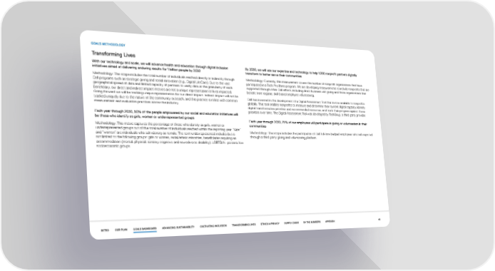 GOALS METHODOLOGY Transforming Lives With our technology and scale, we will advance health and education through digital inclusion By 2030, we will use our expertise and technology to help 1,000 nonprofit partners digitally initiatives aimed at delivering enduring results for 1 billion people by 2030 transform to better serve their communities Methodology: The scope includes the total number of individuals reached directly or indirectly through Methodology: Currently, this measurement covers the number of nonprofit organizations that have Dell programs such as strategic giving and social innovation (e.g., Digital LifeCare). Due to the vast participated in a Tech Pro Bono program. We are developing measurements to include nonprofits that are geographical spread of data and limited capacity of partners to verify data at the granularity of each supported through other Dell efforts, including direct business unit giving and those organizations that beneficiary, our direct and indirect impact metrics are not a unique representation of lives impacted. benefit from organic, skill-based employee volunteering. Going forward we will be tracking unique representation for our direct impact. Indirect impact will not be Dell has invested in the development of a Digital Assessment Tool that is now available to nonprofits tracked uniquely due to the nature of the community outreach, and this practice is in line with common globally. This tool enables nonprofits to measure and determine their current digital capacity, identify measurement and evaluation practices across the industry. digital transformation priorities and recommended resources, and track their progress against those Each year through 2030, 50% of the people empowered by our social and education initiatives will priorities over time. The Digital Assessment Tool was developed by TechSoup, a third-party provider. be those who identify as girls, women or underrepresented groups Each year through 2030, 75% of our employees will participate in giving or volunteerism in their Methodology: This metric captures the percentage of those who identify as girls, women or communities underrepresented groups out of the total number of individuals reached within the reporting year. “Girls” Methodology: The scope includes the participation of Dell full-time badged employees who self-reported and “women” are individuals who self-identify as female. The term underrepresented includes but is through a third-party giving and volunteering platform. not limited to the following groups: girls or women, racial/ethnic minorities, beneficiaries requiring an accommodation (mental, physical, sensory, cognitive and neurodiverse disability), LGBTQIA+ persons, low socioeconomic groups. INTRO OUR PLAN GOALS DASHBOARD ADVANCING SUSTAINABILITY CULTIVATING INCLUSION TRANSFORMING LIVES ETHICS & PRIVACY SUPPLY CHAIN BY THE NUMBERS APPENDIX 40