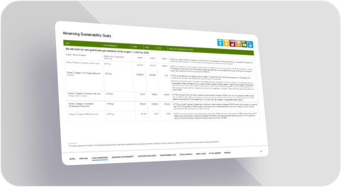Advancing Sustainability Goals Goal Unit of Measure FY20 FY21 FY22 About Our Performance in FY22 We will reach net zero greenhouse gas emissions across scopes 1, 2 and 3 by 2050 Scope 1: Direct emissions Metric tons CO equivalent 57,000 44,200 45,600 In FY22, our scope 1 emissions increased by 1,400 metric tons. This represents a 20.0% decrease from our adjusted FY20 baseline. We 2 5 (MTCO2e) attribute the FY22 changes to a minor increase in fuel consumption compared to the previous year. Scope 2: Indirect emissions, market-based MTCOe 233,300 172,200 158,100 In FY22, we reduced our scope 2 market-based emissions by 14,100 metric tons. This represents a 32.2% decrease from our adjusted 2 FY20 baseline. We attribute the FY22 decrease to added renewable electricity purchases and to energy conservation activities, real estate right-sizing and the continuing impacts of COVID-19.6 Scope 3, Category 1: Purchased goods and MTCOe 8,758,600 8,767,800 N/A In FY21, we are reporting an increase in scope 3, category 1 emissions of 9,200 metric tons compared to our FY20 baseline. This 2 services increase is due to product demand shifts during the first year of the pandemic. For FY22, we have improved our calculation methodology and reporting approach to scope 3, category 1. Our revised approach now incorporates our fiscal year spend with our indirect and direct suppliers’ scope 3 category 1 reports, where available. This ensures our calculations use our most recent supplier emissions data, as well as direct and indirect spend from the same reporting period. As a result, we are not reporting FY22 progress as this information is dependent on supplier emissions data that will not be available until 7 January 2023. Scope 3, Category 3: Upstream fuel- and MTCOe 131,700 105,500 143,000 In FY22, the scope 3 fuel- and energy-related activities emissions increased by 37,500 metric tons. This represents a 8.6% increase 2 energy-related activities from our FY20 baseline. While this category is related to the purchase of fuels and electricity, it also depends on 3rd party emission factors. We attribute the FY22 increase mainly to the year over year changes in the published emission factors. Scope 3, Category 4: Upstream MTCOe 763,400 1,098,200 1,336,100 In FY22, our scope 3 upstream transportation/ distribution travel emissions increased by 572,754 metric tons compared to our starting 2 transportation/distribution year, FY20. This represents a 75.0% increase. We attribute this to increased shipments by air and an increase in accuracy through additional information sharing with our logistics carriers. Scope 3, Category 6: Business travel MTCOe 314,300 61,400 19,600 In FY22, our scope 3 business travel emissions were reduced by 41,800 metric tons. This represents a 93.8% decrease from our FY20 2 baseline, even while adding two additional categories of emissions, hotel stays and rental cars starting with our FY21 numbers. We attribute the FY22 decrease to additional reduced business travel due to COVID-19. Third-party assurance for Scopes 1, 2 and 3 greenhouse gas emissions, total energy, renewable electricity, packaging and water withdrawal is currently underway. An updated version of this report will be provided once these figures are assured. INTRO OUR PLAN GOALS DASHBOARD ADVANCING SUSTAINABILITY CULTIVATING INCLUSION TRANSFORMING LIVES ETHICS & PRIVACY SUPPLY CHAIN BY THE NUMBERS APPENDIX 27