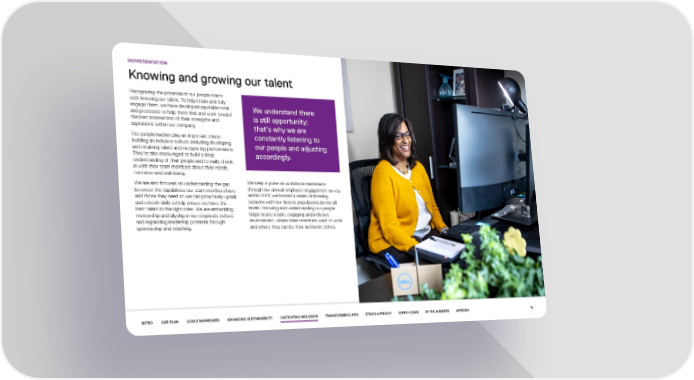 REPRESENTATION Knowing and growing our talent Recognizing the potential of our people starts with knowing our talent. To help retain and fully engage them, we have developed equitable tools We understand there and processes to help them find and work toward is still opportunity; the best intersection of their strengths and aspirations within our company. that’s why we are Our people leaders play an important role in constantly listening to building an inclusive culture, including developing our people and adjusting and retaining talent and recognizing performance. They’re also encouraged to build a deep accordingly. understanding of their people and to really check in with their team members about their needs, concerns and well-being. We are also focused on understanding the gap We keep a pulse on workforce sentiments between the capabilities our team members have through our annual employee engagement survey, and those they need so we can proactively upskill and in 2021, we hosted a series of listening and refresh skills to help ensure we have the sessions with our diverse populations across all best talent in the right roles. We are embedding levels. Knowing and understanding our people mentorship and allyship in our corporate culture helps create a safe, engaging and inclusive and expanding leadership potential through environment, where team members want to work sponsorship and coaching. and where they can be their authentic selves. INTRO OUR PLAN GOALS DASHBOARD ADVANCING SUSTAINABILITY CULTIVATING INCLUSION TRANSFORMING LIVES ETHICS & PRIVACY SUPPLY CHAIN BY THE NUMBERS APPENDIX 76