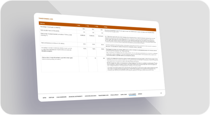 TRANSFORMING LIVES Metrics FY20 FY21 FY22 Notes Percentage of employees volunteering 59% 51% 50% We attribute the decrease to the continued negative impact that COVID-19 had on in-person volunteerism and multiple Dell offices remaining closed throughout FY22. Total volunteer hours (in thousands) 914 516 709 Total number of people reached (cumulative, FY20 to current 46,588,226 93,565,402 159,742,242 Our “1 Billion Lives” goal tracks the number of people who are reached through our health and education initiatives. Due to the vast reporting FY) geographical spread of data and limited capacity of partners to verify data at the granularity of each beneficiary, our direct and indirect impact metrics are not a unique representation of lives impacted. Going forward we will be tracking unique representation for our direct impact. Indirect impact will still remain as a metric that will not be tracked uniquely due to the nature of the community outreach, and this is in line with common measurement and evaluation practices across the industry. Total contributions (in millions of U.S. dollars) $51.6 $49.9 $60.9 This metric represents total cash as well as in-kind products and services contributions, valued at fair market value for the respective fiscal year. This value does not include contributions from employees, vendors or customers. Percentage of people reached who identify as girls, women 51.7% 56.1% 59.3% Percentage of individuals who voluntarily identify as girls, women or members of underrepresented groups within the total number of or underrepresented groups empowered by our social and individuals reached as reported in the “1 Billion Lives” goal. education programs “Girls” and “women” are individuals who self–identify as female. The term underrepresented includes but is not limited to the following groups: girls or women, racial/ethnic minorities, beneficiaries requiring an accommodation (mental, physical, sensory, cognitive and neurodiverse disability), LGBTQIA+ persons, low socioeconomic groups. Total number of nonprofit partners supported in their digital 11 76 222 Currently, this measurement covers the number of nonproft organizations that have participated in a Tech Pro Bono program. We are transformation journey (cumulative) developing measurements to include nonprofits that are supported through other Dell efforts, including direct business unit giving and those organizations that benefit from organic, skill-based employee volunteering. Dell Technologies has invested in the development of a Digital Assessment Tool that is now available to nonprofits globally. This tool allows nonprofits to measure and determine their current digital transformation priorities and helps them track their progress over time. The Digital Assessment Tool was developed by TechSoup, a third-party provider. The number of nonprofits reached in FY21 was previously overrreported by one. After accounting for a repeat workshop participant, the number of nonprofit partners supported through our Tech Pro Bono programs in FY21 was 65. With this adjustment, the cumulative total in FY21 was 76 and in FY22 is 222 nonprofits supported on their digital transformation journeys to date. INTRO OUR PLAN GOALS DASHBOARD ADVANCING SUSTAINABILITY CULTIVATING INCLUSION TRANSFORMING LIVES ETHICS & PRIVACY SUPPLY CHAIN BY THE NUMBERS APPENDIX 147
