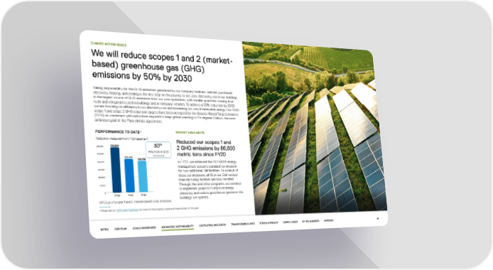 CLIMATE ACTION GOALS We will reduce scopes 1 and 2 (market- based) greenhouse gas (GHG) emissions by 50% by 2030 Taking responsibility for the GHG emissions generated by our company facilities; vehicles; purchased electricity, heating, and cooling is the first step on the journey to net zero. Electricity use in our buildings is the largest source of GHG emissions from our own operations, with smaller quantities coming from fuels and refrigerants used in buildings and in company vehicles. To achieve a 50% reduction by 2030, we are focusing on efficiency in our electricity use and increasing our use of renewable energy. Our 2030 scope 1 and scope 2 GHG reduction targets have been accepted by the Science Based Targets initiative (SBTi) as consistent with reductions required to keep global warming to 1.5 degrees Celsius, the most ambitious goal of the Paris climate agreement. PERFORMANCE TO DATE* RECENT HIGHLIGHTS 21 Reduction measured from FY20 baseline. Reduced our scopes 1 and 290,300 % 300,000 30 2 GHG emissions by 86,600 reduction in GHG 250,000 emissions metric tons since FY20 216,300 203,700 200,000 In FY22, we achieved the ISO 50001 energy management systems standard certification 150,000 for two additional Dell facilities. As a result of 100,000 these certifications, all 10 of our Dell-owned manufacturing facilities are now certified. 50,000 Through this and other programs, we continue to implement projects to improve energy 0 efficiency and reduce greenhouse gasses in the FY20 FY21 FY22 buildings we operate. MTCOe of scopes 1 and 2 (market-based) GHG emissions 2 *Please see our 2030 Goals Dashboard for more on the progress, scope and measurement of this goal. INTRO OUR PLAN GOALS DASHBOARD ADVANCING SUSTAINABILITY CULTIVATING INCLUSION TRANSFORMING LIVES ETHICS & PRIVACY SUPPLY CHAIN BY THE NUMBERS APPENDIX 48