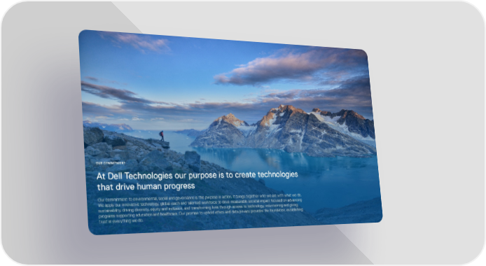OUR COMMITMENT At Dell Technologies our purpose is to create technologies that drive human progress Our commitment to environmental, social and governance is this purpose in action. It brings together who we are with what we do. We apply our innovative technology, global reach and talented workforce to drive measurable societal impact focused on advancing sustainability, driving diversity, equity and inclusion, and transforming lives through access to technology, volunteering and giving programs supporting education and healthcare. Our promise to uphold ethics and data privacy provides the foundation, establishing trust in everything we do.