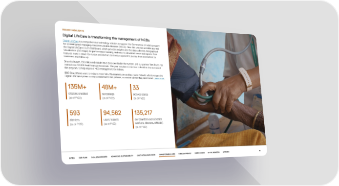 RECENT HIGHLIGHTS Digital LifeCare is transforming the management of NCDs Digital LifeCare is a comprehensive technology solution to support the Government of India’s program for screening and managing noncommunicable diseases (NCDs). New this year are a mobile app and the Digital LifeCare (DLC) Dashboard, which provides insights into the data collected, Geographical Visualization (GIS maps) for performance tracking, and easy-to-download views and reports. Both features make it easier for nurses and doctors to monitor a patient’s journey from assessment to treatment and follow-up. Since its launch, 135 million individuals have been enrolled in the system, and our partner Tata Trusts has trained over 94,000 healthcare professionals. This year we plan to continue to build on the success of this program, to help improve NCD management for millions. BBC StoryWorks went to India to meet Mrs. Ravanamma, an auxiliary nurse midwife who leverages the Digital LifeCare system to stay connected to her patients, no matter where they are located. Learn more. 135M+ 48M+ 33 citizens enrolled screenings actives states (as of FY22) (as of FY22) (as of FY22) 593 94,562 135,217 districts users trained on-boarded users (health (as of FY22) (as of FY22) workers, doctors, officials) (as of FY22) INTRO OUR PLAN GOALS DASHBOARD ADVANCING SUSTAINABILITY CULTIVATING INCLUSION TRANSFORMING LIVES ETHICS & PRIVACY SUPPLY CHAIN BY THE NUMBERS APPENDIX 88