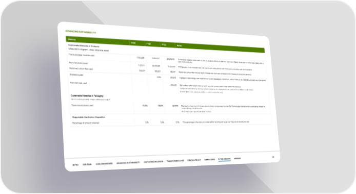 ADVANCING SUSTAINABILITY Metrics FY20 FY21 FY22 Notes Sustainable Materials in Products Measured in kilograms unless otherwise noted Total sustainable materials used 11,521,288 12,594,607 25,258,183 Sustainable materials value went up due to validation efforts of steel and aluminium. Plastic values also increased due to being able to claim more products. Recycled plastics used 11,217,311 12,007,480 19,223,743 PCR plastics have increased year over year due to being able to claim more parts and obtain additional validation. Reclaimed carbon fiber used 303,977 582,591 682,157 Reclaimed carbon fiber showed slight increase year over year correlated with increases in production demands. Bioplastics used 4,536 280,876 A different methodology was implemented to claim bioplastics. A shift from product basis to raw material purchased was implemented. Recycled steel used 4,945,428 Dell worked within supply chain to verify recycled content used in steel parts in our products. Verification was done by an independent third party to a recycled content standard that conforms to ISO 14021. In FY22 Dell is only reporting verified recycled content for steel. Sustainable Materials in Packaging Measured in pounds unless otherwise noted Ocean-bound plastic used 73,366 118,875 227,595 Represents the amount of ocean–bound plastic incorporated into new Dell Technologies-branded product packaging, shipped to original design manufacturers. FY22 fiscal year reporting is dated 1/31/22. Responsible Electronics Disposition Percentage of product collected 9.1% 9.6% 12.1% This percentage is the total units collected for recycling and reuse over the amount of products sold. INTRO OUR PLAN GOALS DASHBOARD ADVANCING SUSTAINABILITY CULTIVATING INCLUSION TRANSFORMING LIVES ETHICS & PRIVACY SUPPLY CHAIN BY THE NUMBERS APPENDIX 140