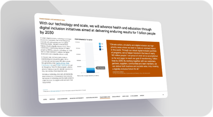 TRANSFORMING LIVES MOONSHOT GOAL With our technology and scale, we will advance health and education through digital inclusion initiatives aimed at delivering enduring results for 1 billion people by 2030 In today’s digital economy, technology is no longer PERFORMANCE TO DATE* a luxury, but a necessity that is becoming more 1,000,000,000 essential with each passing year. As a global FY22 “Climate action, circularity and digital inclusion are high- technology leader, Dell plays a critical role in FY21 priority areas where we seek to make an outsized impact helping to build a digitally inclusive future. We’re committed to transforming the lives of 1 billion 800,000,000 FY20 in the world. Through our robust digital inclusion portfolio people by 2030 by using our technology, our scale of programs, we’ve helped transform the lives of nearly and our team members to address the digital divide and create a digitally inclusive world. 600,000,000 160 million people! I am proud of what we’ve accomplished In the past year, we have made strides in so far and eager to reach our goal of transforming 1 billion transforming lives around the globe. We’ve cumulatively reached nearly 160 million people 400,000,000 lives by 2030. By working together with our customers, through initiatives like Digital LifeCare, Solar partners, suppliers, communities and team members, we Community Hubs and Student TechCrew, as well can deliver both business and societal value, truly creating as through our Tech Pro Bono program, which is 200,000,000 aimed at helping nonprofits digitally transform so 159,742,242 a digitally inclusive future for all.” they can continue their important work. CASSANDRA GARBER 0 VP, ESG (ENVIRONMENTAL, SOCIAL AND GOVERNANCE), DELL TECHNOLOGIES We believe technology does and will dramatically improve lives, but it is imperative that everyone Total number of people reached (cumulative) has access to technology and the skills needed to make the most of a digital world and reach their full potential. *Please see our 2030 Goals Dashboard for more on the progress, scope and measurement of this goal. INTRO OUR PLAN GOALS DASHBOARD ADVANCING SUSTAINABILITY CULTIVATING INCLUSION TRANSFORMING LIVES ETHICS & PRIVACY SUPPLY CHAIN BY THE NUMBERS APPENDIX 87