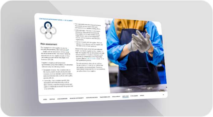 CONTINUOUS IMPROVEMENT MODEL — 1ST ELEMENT • Prior responsible manufacturing performance: This includes previous audit results and participation in our capability building efforts. • Additional insight: This refers to information obtained by Dell social and environmental responsibility (SER) team members during regular factory visits or from independent sources, such as regulatory and third-party organizations. • Amount of spend with the supplier: This is an Risk assessment indicator of our influence with the supplier and the relative size of their operations. Our engagement with suppliers at any tier — Based on the results of the SAQ and additional 45 including final assembly, direct and sub-tier insight, we classify suppliers as low-, medium- or — begins with an assessment of their social high-risk. Suppliers that are determined to be high and environmental risks. We conduct initial risk risk are required to complete a third-party audit assessments for our suppliers as part of their that looks at conformance to the Responsible onboarding process before they begin to do Business Alliance Code of Conduct as part of our business with Dell. SER qualification process. Suppliers complete a self-assessment Our risk assessment efforts do not end here. questionnaire (SAQ) that enables us to determine We also monitor SER risk for our Dell factories risk level using the following criteria: and suppliers on an annual basis. Continuous • Geographic location: This considers risks at improvement is important for our own operations, the country and/or local level around social as well as those of our suppliers. concerns, such as child labor and forced labor, and environmental risks, such as water quality and air pollution. • Commodity: This considers specific risks associated with manufacturing, such as labor intensity, manufacturing processes and paints or chemicals involved in the production of a commodity. INTRO OUR PLAN GOALS DASHBOARD ADVANCING SUSTAINABILITY CULTIVATING INCLUSION TRANSFORMING LIVES ETHICS & PRIVACY SUPPLY CHAIN BY THE NUMBERS APPENDIX 107