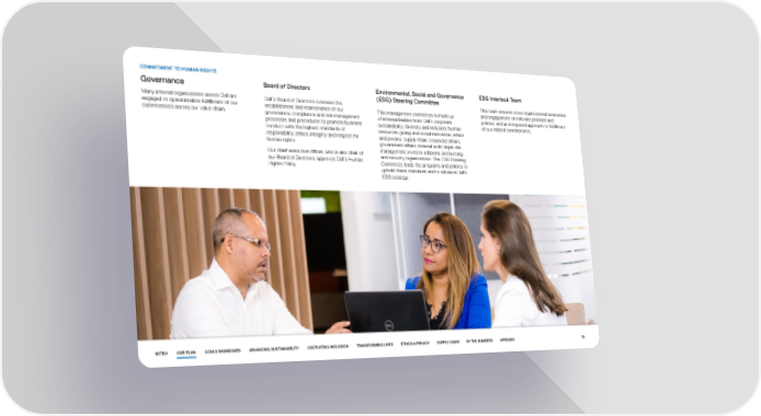 COMMITMENT TO HUMAN RIGHTS Governance Board of Directors Environmental, Social and Governance ESG Interlock Team Many internal organizations across Dell are (ESG) Steering Committee Dell’s Board of Directors oversees the This team ensures cross organizational awareness engaged to operationalize fulfillment of our establishment and maintenance of our This management committee is made up and engagement on relevant priorities and commitments across our value chain. governance, compliance and risk management of internal leaders from Dell’s corporate policies, and an integrated approach to fulfillment processes and procedures to promote business sustainability; diversity and inclusion; human of our related commitments. conduct with the highest standards of resources; giving and social innovation; ethics responsibility, ethics, integrity and respect for and privacy; supply chain; corporate affairs; human rights. government affairs; internal audit; legal; risk Our chief executive officer, who is also chair of management; investor relations; accounting; our Board of Directors, approves Dell’s Human and security organizations. The ESG Steering Rights Policy. Committee leads the programs and policies to uphold these standards and to advance Dell’s ESG strategy. INTRO OUR PLAN GOALS DASHBOARD ADVANCING SUSTAINABILITY CULTIVATING INCLUSION TRANSFORMING LIVES ETHICS & PRIVACY SUPPLY CHAIN BY THE NUMBERS APPENDIX 20