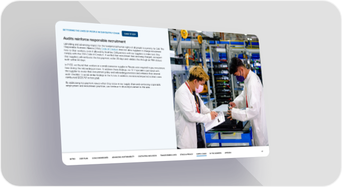 BETTERING THE LIVES OF PEOPLE IN OUR SUPPLY CHAIN CASE STUDY Audits reinforce responsible recruitment Upholding and advancing respect for the fundamental human rights of all people is a priority for Dell. The Responsible Business Alliance (RBA) Code of Conduct does not allow suppliers to charge recruitment fees to their workers, even if allowed by local law. Dell partners with our suppliers to make sure they comply with the RBA Code of Conduct. If we find that recruitment fees are being charged, we expect that suppliers will reimburse the fee payment within 30 days and validate this through an RBA closure audit within 90 days. In FY22, we found that workers at a small connector supplier in Taiwan were required to pay recruitment fees during the onboarding process. To address these findings, our SER specialists partnered with the supplier to revise their recruitment policy and onboarding processes and enhance their internal audit checklist to avoid similar findings in the future. In addition, we ensured impacted workers were reimbursed $325,797 in fees paid. By addressing fee payment issues when they occur in our supply chain and reinforcing responsible employment and recruitment practices, we continue to drive improvement in this area. INTRO OUR PLAN GOALS DASHBOARD ADVANCING SUSTAINABILITY CULTIVATING INCLUSION TRANSFORMING LIVES ETHICS & PRIVACY SUPPLY CHAIN BY THE NUMBERS APPENDIX 117