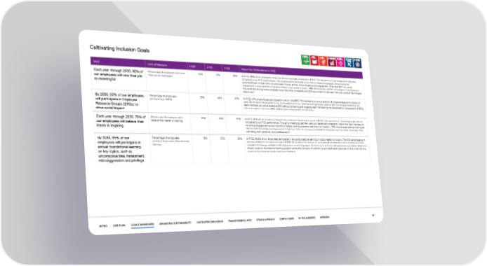 Cultivating Inclusion Goals Goal Unit of Measure FY20 FY21 FY22 About Our Performance in FY22 Each year through 2030, 90% of Percentage of employees who rate 93% 91% 88% In FY22, 88% of our employees rated their job as meaningful (measured in FY23). This represents a 3-percentage point decrease our employees will rate their job their job as meaningful compared to our FY21 performance. This could be partly attributed to our shift to measure employees’ sense of personal as meaningful accomplishment in their work, as we’ve seen this is a primary driver of energy and engagement. Other data from our annual engagement survey indicates employees believe in our overall purpose – 88% of employees said Dell Technologies is contributing to the world and driving human progress more than other companies, and 92% saw a clear link between their work and Dell Technologies’ 14 objectives. By 2030, 50% of our employees Percentage of employees 33% 44% 47% In FY22, 47% of employees participated in one or more ERG. This represents an annual addition of 3.0 percentage points toward our will participate in Employee participating in ERGs goal. We attribute this progress to our continued focus on our 2030 Cultivating Inclusion goals by Dell Technologies’ leadership and Resource Groups (ERGs) to team members, as well as extensive ERG efforts connecting and engaging team members during the pandemic, the expansion of ERGs into new regions, and cross-ERG collaborations on key events and initiatives. drive social impact Each year through 2030, 75% of Percentage of employees who 83% 83% 87% In FY22, 87% of our employees believed their leader was inspiring (measured in FY23). This represents a 4-percentage point increase our employees will believe their believe their leader is inspiring compared to our FY21 performance. Through a challenging past few years, our leaders still consistently inspire their team members. In leader is inspiring our annual engagement survey, two of our highest scoring questions were about our leaders – 93% of employees believed their leader has the skills, knowledge and experience to lead their team into the future, and 93% of employees said their leader cared about their 15 well-being, both personally and professionally. By 2030, 95% of our Percentage of employees 15% 33% 99% In FY22, 99.6% of our employees participated in annual foundational learning on topics related to inclusion. The 66.6 percentage point employees will participate in participating in annual foundational increase allowed us to surpass our goal of 95%. We attribute this increase to our launch of an innovative, new e-learning experience annual foundational learning learning titled Be the Change, available to all employees in various languages. Transitioning to a shorter, self-paced learning model enabled us to broadly scale our foundational learning program across the company. In addition, we provided leader resources to drive more inclusive on key topics, such as conversations between leaders and team members. unconscious bias, harassment, microaggression and privilege INTRO OUR PLAN GOALS DASHBOARD ADVANCING SUSTAINABILITY CULTIVATING INCLUSION TRANSFORMING LIVES ETHICS & PRIVACY SUPPLY CHAIN BY THE NUMBERS APPENDIX 32