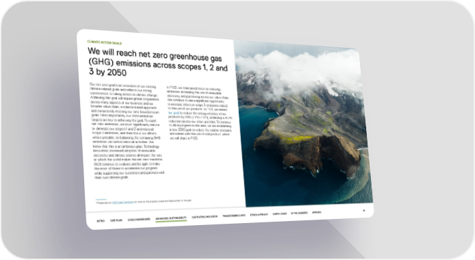CLIMATE ACTION GOALS We will reach net zero greenhouse gas (GHG) emissions across scopes 1, 2 and 3 by 2050 Our net zero goal is an extension of our existing In FY22, we maintained focus on reducing climate-related goals and reflects our strong emissions, increasing the use of renewable commitment to taking action on climate change. electricity and partnering across our value chain. Achieving this goal will require global cooperation We continue to see a significant opportunity across many aspects of our business and our to increase efforts in scope 3 emissions related broader value chain, a science-based approach to the use of our products. In FY21, we retired and consistently meeting our time-bound interim our goal to reduce the energy intensity of our goals. Most importantly, our 2030 emissions products by 80% (FY12–FY21), achieving a 76.7% targets are key to achieving the goal. To reach reduction across our entire portfolio. To continue net zero emissions, we must significantly reduce to drive progress in this area, we are establishing or eliminate our scopes 1 and 2 and material a new 2030 goal to reduce the carbon emissions scope 3 emissions, and then focus our efforts, associated with the use of sold product, which where possible, on balancing the remaining GHG we will share in FY23. emissions via carbon removal activities. We know that this is an ambitious plan. Technology innovation, increased adoption of renewable electricity and climate science all impact the rate at which the world makes the net zero transition. We’ll continue to evaluate and be agile to make the most of these to accelerate our progress while supporting our customers and partners with their own climate goals. *Please see our 2030 Goals Dashboard for more on the progress, scope and measurement of this goal. INTRO OUR PLAN GOALS DASHBOARD ADVANCING SUSTAINABILITY CULTIVATING INCLUSION TRANSFORMING LIVES ETHICS & PRIVACY SUPPLY CHAIN BY THE NUMBERS APPENDIX 46