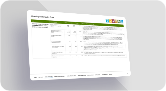 Advancing Sustainability Goals Goal Unit of Measure FY20 FY21 FY22 About Our Performance in FY22 Each year through 2030, we will Number of feedback interviews 12,487 11,699 12,641 In FY22, 12,641 feedback interviews were conducted with supply chain workers during Responsible Business Alliance (RBA)-certified, continue engagement with the conducted with supply chain (CY19) (CY20) third-party factory audits. This represents an 8.1% increase over our previous reporting period and a 1.2% increase since we began people who make our products workers reporting this metric. We attribute this increase to an ability to increase the number of supplier audits we were able to complete as COVID-19 restrictions eased. Percentage of manufacturing 99% 100% 100% In FY22, 100% of our manufacturing facilities had feedback channels in place. There is no change in results for this metric since the facilities with feedback channels (CY19) (CY20) previous reporting period, and this represents a 1.0% increase compared to when we first began reporting this metric. We attribute this in place increase to our continued support of our manufacturing facilities. Number of ideation sessions 303 271 271 In FY22, Dell factory team members participated in 271 ideation sessions at in-house factories. There is no change in results for in-house this metric since the previous reporting period, and this represents a 10.6% decrease compared to when we first began reporting this metric. We are committed to holding events that drive creative best practice sharing while adhering to COVID-19 health and safety protocols. In-house innovation ideas 620 826 1,405 In FY22, we implemented 1,405 Dell factory team member innovation ideas as projects. This represents an increase of 70.1% and implemented as projects an increase of 126.6% compared to when we first began reporting this metric. We attribute this increase to the maturation of our innovation process through centralized tools, resources and event planning led by our Culture of Innovation team. Level of participation in in-house 97% 86% 92% In FY22, 92.0% of Dell factory team members participated in in-house ideation sessions. This represents a 7.0% increase over the ideation sessions previous reporting period and a 5.2% decrease compared to when we first began reporting on this metric. We attribute our recent increase to stronger coordination across all our Dell factory locations to create meaningful, exciting and innovation-focused events for frontline team members and managers. Number of ideas submitted in N/A N/A 8,131 In FY22, 8,131 ideas were submitted by workers to management as part of a pilot program with two suppliers to support worker supply chain engagement and drive innovation. Number of ideas implemented in N/A N/A 7,763 In FY22, 7,763 ideas were implemented as part of a pilot program with two suppliers to drive innovation through worker engagement. supply chain INTRO OUR PLAN GOALS DASHBOARD ADVANCING SUSTAINABILITY CULTIVATING INCLUSION TRANSFORMING LIVES ETHICS & PRIVACY SUPPLY CHAIN BY THE NUMBERS APPENDIX 30