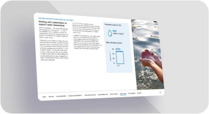 REDUCING OUR SUPPLY CHAIN’S IMPACT ON THE PLANET Working with stakeholders to In FY22, 207 of our supplier factories Freshwater saved in FY22 support water stewardship implemented water management plans. Through this work, these suppliers saved 40.9 million cubic Water stewardship — the responsible planning meters of fresh water and reduced the amount 40.9 and management of resources56 — is vital to of wastewater they discharged by 37.1 million million meters3 a sustainable future. In addition to water use cubic meters. considerations around the manufacturing of our In addition to considering our own supply chain’s products, a number of our suppliers operate in water use, we recognize the importance of areas of water stress. understanding shared risk and engaging with Dell partners with suppliers in China who have stakeholders across the full catchment area. Water discharge reduced water-intensive processes or operate factories Reflective of this, factory water risk mitigation located in water-stressed areas where at least plans include engagement with stakeholders, such 20% of renewable surface and groundwater is as municipal water providers, local community 37.1m withdrawn annually and is insufficient to meet members and wastewater treatment plants. 40 - 57 a region’s needs. For the past seven years, 3s we have worked closely with these suppliers er 30 - to analyze their water use, offer training, and t develop and implement water management plans to achieve reductions in water use and 20 - wastewater discharge. million me 10 - FY22 INTRO OUR PLAN GOALS DASHBOARD ADVANCING SUSTAINABILITY CULTIVATING INCLUSION TRANSFORMING LIVES ETHICS & PRIVACY SUPPLY CHAIN BY THE NUMBERS APPENDIX 128
