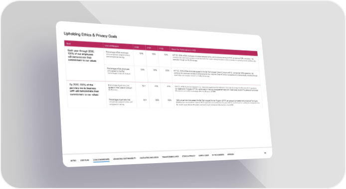 Upholding Ethics & Privacy Goals Goal Unit of Measure FY20 FY21 FY22 About Our Performance in FY22 Each year through 2030, Percentage of Dell employees 100% 100% 100% In FY22, 100% of Dell employees completed assigned ethics and compliance training. In FY21, we reported 100% completion. We 100% of our employees who completed assigned ethics attribute this continued success to improvements that made training completion more accessible to a growing remote workforce, for will demonstrate their and compliance training example, through our My Ethics app. commitment to our values Percentage of Dell employees 100% 100% 100% In FY22, 100% of Dell employees agreed to the Dell Technologies Code of Conduct. In FY21, we reported 100% agreement. We who agreed to the Dell attribute this continued success to enhancements that make the Code of Conduct accessible and understandable, including through Technologies Code of Conduct searchable and modular content in the My Ethics app. By 2030, 100% of the Percentage of partners that N/A 96% 94% In FY22, 94% of partners agreed to our values and expectations as defined in the Code of Conduct for Partners. FY21 represents partners we do business agreed to the Code of Conduct our baseline for this goal. In FY22, we focused on tracking the agreement data from metal-tiered Solution Providers and Authorized with will demonstrate their for Partners Distributors in the Dell Technologies Partner Program (DTPP). commitment to our values Percentage of partners that N/A 100% 100% 100% of partners that passed the Dell Technologies Partner Program (DTPP) annual audit completed the Compliance Training for completed assigned ethics and Dell Partners course where required. FY21 represents our baseline for this goal. In FY22, we focused on tracking the completion data compliance training for metal-tiered Solution Providers and Authorized Commercial Distributors in the DTPP. INTRO OUR PLAN GOALS DASHBOARD ADVANCING SUSTAINABILITY CULTIVATING INCLUSION TRANSFORMING LIVES ETHICS & PRIVACY SUPPLY CHAIN BY THE NUMBERS APPENDIX 35