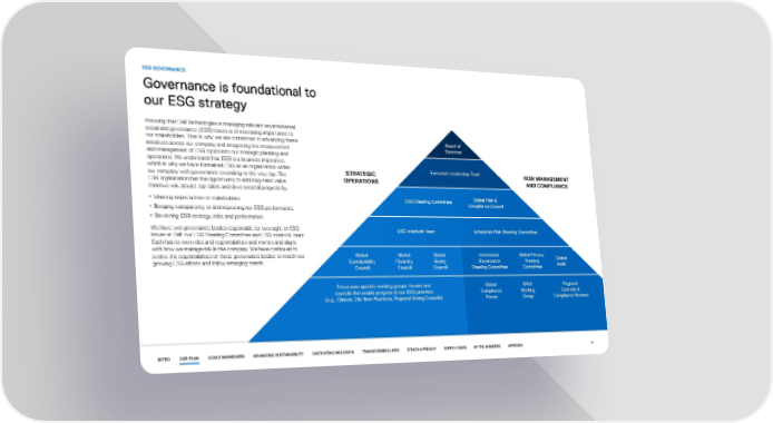 ESG GOVERNANCE Governance is foundational to our ESG strategy Knowing that Dell Technologies is managing relevant environmental, social and governance (ESG) issues is of increasing importance to our stakeholders. That is why we are committed to advancing these Board of initiatives across our company and integrating the measurement Directors and management of ESG topics into our strategic planning and operations. We understand that ESG is a business imperative, which is why we have formalized ESG as an organization within STRATEGIC E…ecuti e †eadership „eam RISK MANAGEMENT our company with governance extending to the very top. The OPERATIONS ESG organization has the opportunity to add long-term value, AND COMPLIANCE minimize risk, attract top talent and drive societal progress by: • Meeting expectations of stakeholders. ESG Steering ommittee Global isk • Bringing transparency to and improving our ESG performance. ompliance ouncil • Governing ESG strategy, risks and performance. We have two governance bodies responsible for oversight of ESG ESG nterlock „eam Enterprise isk Steering ommittee issues at Dell: our ESG Steering Committee and ESG Interlock Team. Each has its own roles and responsibilities and mirrors and aligns with how we manage risk in the company. We have continued to evolve the responsibilities of these governance bodies to match our Global Global Global nformation Global ri acƒ Global growing ESG efforts and follow emerging trends. Sustainabilitƒ Di ersitƒ Gi ing Go ernance Steering ‡udit ouncil ouncil ouncil Steering ommittee ommittee Focus area-specific working groups, forums and Global E€ egional councils that enable progress to our ESG priorities ompliance ‚orking ontrols (eg, limate, D Best ractices, egional Gi ing ouncils Forum Group ompliance e iews INTRO OUR PLAN GOALS DASHBOARD ADVANCING SUSTAINABILITY CULTIVATING INCLUSION TRANSFORMING LIVES ETHICS & PRIVACY SUPPLY CHAIN BY THE NUMBERS APPENDIX 11