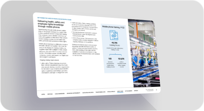 BETTERING THE LIVES OF PEOPLE IN OUR SUPPLY CHAIN Delivering health, safety and • Health and safety: Safety training; guidelines employee rights knowledge on the use of process chemicals; how to use Mobile phone training, FY22 personal protective equipment; the importance through mobile phones of daily machine safety checks; and fire and emergency procedures. Digital learning through mobile phones enables • Personal development (optional for workers): many of the people working in our supply chain Financial literacy, career development and to have consistent access to important training. communication skills. This continues to be a valuable tool in how we work with suppliers to help ensure their workers • COVID-19 prevention: Dell continued to offer receive training on areas such as health and workplace safety modules designed to address safety protocols and awareness of labor rights. ongoing challenges of the pandemic. 49,796 Mobile phone learning is a collaborative initiative Mobile phone learning opportunities increase training hours between Dell and our suppliers. We cover the knowledge and skills and improve safety. In completed through mobile phone costs of developing the training modules; our addition, workers are empowered by ensuring training courses suppliers make them available to their workers their understanding of their rights and the and cover the cost of Wi-Fi to ensure internet availability of grievance mechanisms to help access. All frontline workers, including direct, identify areas of nonconformance with standards temporary, student and migrant, are eligible and in their factories. encouraged to participate. 100 101,876 Ongoing training topics include: factories workers • Labor rights: Policies banning recruitment participated in completed mobile fees; contract requirements; pay structures; mobile phone phone training rules around voluntary overtime; requirements training courses courses for factories to pay social insurance benefits; rights to paid leave and holidays; grievance mechanisms; and right to resign from work. INTRO OUR PLAN GOALS DASHBOARD ADVANCING SUSTAINABILITY CULTIVATING INCLUSION TRANSFORMING LIVES ETHICS & PRIVACY SUPPLY CHAIN BY THE NUMBERS APPENDIX DELL TECHNOLOGIES 121 FY22 ESG REPORT