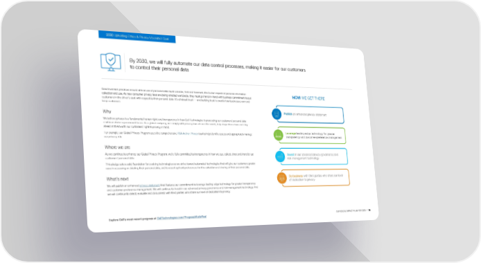 2030 Upholding Ethics & Privacy Moonshot Goal By 2030, we will fully automate our data control processes, making it easier for our customers to control their personal data Good business practices around ethical use of personal data must consider, first and foremost, the human impact of personal information HOW WE GET THERE collection and use. As new consumer privacy laws are being enacted worldwide, they must go hand-in-hand with business commitment to put customers in the driver’s seat with respect to their personal data. It’s all about trust — and building trust is exactly how businesses earn and keep customers. Why Publish an enhanced privacy statement We believe privacy is a fundamental human right, and transparency in how Dell Technologies is processing our customers’ personal data continues to be a paramount focus. As a global company, we comply with privacy laws all over the world, help shape these laws and stay ahead of them with our customers’ right to privacy in mind. For example, our Global Privacy Program uses the comprehensive RSA Archer Privacy tool to help identify, assess and appropriately manage Leverage leading-edge technology for greater our privacy risk. transparency and customer-preference management Where we are As we continue to enhance our Global Privacy Program, we’re fully committed to transparency in how we use, collect, share and transfer our Invest in our advanced privacy governance and customers’ personal data. risk-management technology This pledge sets a solid foundation for evolving technologies as we strive toward automated technologies that will give our customers greater ease in accessing or deleting their personal data, and to assert upfront preferences for the collection and sharing of their personal data. What’s next Do business with third parties who share our level of dedication to privacy We will publish an enhanced privacy statement that features our commitment to leverage leading-edge technology for greater transparency and customer-preference management. We will continue to invest in our advanced privacy governance and risk-management technology. And we will continue to select, evaluate and do business with third parties who share our level of dedication to privacy. Explore Dell's most recent progress at DellTechnologies.com/ProgressMadeReal OUR SOCIAL IMPACT PLAN FOR 2030 / 36