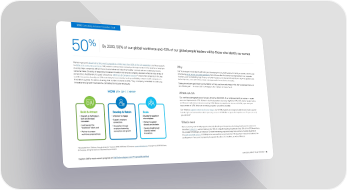2030 Cultivating Inclusion Moonshot Goal % By 2030, 50% of our global workforce and 40% of our global people leaders will be those who identify as women 50 Women represent about half of the world’s population, a little more than 50% of the U.S. population, and they account Why for 85% of all consumer purchases. Still, women continue to be seriously underrepresented in the workforce. Employee diversity helps companies attract more diverse talent and helps them better connect with an increasingly diverse Dell Technologies is dedicated to attracting and developing the very best people who identify as women, with the goal consumer base. Diversity of leadership increases innovation and ensures company decisions reflect a wide variety of of achieving parity across our global operations. But while we often find women well represented in our corporate perspectives. Additionally, it’s good for business: McKinsey & Company research* shows that companies in the top functions, such as marketing, legal, finance or human resources, we also want to seat them in technical positions and quartile for gender diversity are 21% more likely to have industry-leading profitability compared with companies in leadership roles, areas where they remain underrepresented across the tech industry. the bottom quartile. For ethnic diversity, that number increases to 33%. Truly, a company committed to continuing Setting this relevant goal linked to accountability will help us achieve real change in this vital focus area and aid us in innovation and growth must also be committed to inclusion and equity. our ultimate goal — to ensure Dell Technologies is the employer of choice for all. HOW WE GET THERE Where we are Our workforce demographics as of January 2019 show that 30.4% of our employees identify as women — a year- over-year improvement of 1%. Women in technical positions decreased slightly by 0.4%, while women people leaders and those in nontechnical roles increased by 2.8%. Women in people leader roles are at 23.4%, a year-over-year improvement of 0.9%. While we are making progress, we want to do better. Our initiatives support women at all career stages. Our STEM programs are designed to attract and create a pool of talented girls and women interested in pursuing careers in STEM. We recognize the importance of: “If you can see it, you can be it.” What’s next We’re launching new STEM programs aimed at attracting and deepening a technology talent pool of women and minorities. In the U.K., women make up only 19% of computer studies graduates and only 13% of the STEM workforce. We created STEMAspire, an intensive 12-month mentoring program to keep more women university students on the path to STEM careers. STEMAspire has successfully served more than 118 students in Ireland and Scotland, has participants in France and is preparing to expand into other U.K. locations, as well as Morocco. * Excerpted from “Delivery through diversity”, January 2018, McKinsey & Company, www.mckinsey.com. Copyright (c) 2019 McKinsey & Company. All rights reserved. Reprinted by permission. Explore Dell's most recent progress at DellTechnologies.com/ProgressMadeReal OUR SOCIAL IMPACT PLAN FOR 2030 / 20