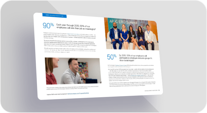 2030 Cultivating Inclusion Goals % Each year through 2030, 90% of our 90 employees will rate their job as meaningful* Employees want meaningful work. According to a Global Talent Trends Study conducted by Mercer in 2018 — the world’s largest human resources consulting firm — 75% of employees who say they are engaged and fulfilled also say they work for a company with a strong sense of purpose — almost double the number of workers who don’t feel they’re thriving. We use our annual Tell Dell employee opinion survey to offer a voluntary, confidential forum for employees to share their feedback about leadership and culture. In 2019, Tell Dell told us that: 95% of employee respondents appreciate their leaders consistently treating employees with respect; 93% are proud to work at Dell Technologies; 90% feel like part of a team; and 89% say they’re satisfied with the company and their work. We pride ourselves on having an open culture where all employees feel comfortable voicing their questions and concerns. This “speak-up” culture and its supporting infrastructure are essential to the success of our diversity and inclusion efforts, and to our company as a whole. % By 2030, 50% of our employees will 50 participate in employee resource groups to drive social impact Dell Technologies’ Employee Resource Groups (ERGs) bring their authentic selves, diverse perspectives and collective voices together to drive our business and social impact. As of July 2019, we have 13 ERGs devoted to four focus areas — gender, ethnicity, identity and various backgrounds — with 380 chapters in more than 60 countries worldwide. According to our annual Tell Dell employee opinion survey in 2019, about 30% of our employees belonged to an ERG where they participated in the groups’ professional development, networking and community involvement opportunities. ERG members who attended six or more events had a 31% higher employee-loyalty average — via the Employee Net Promoter Score® (eNPS) — than non-ERG members. A global measurement tool used by most large corporations, eNPS asks team members how likely they would be to recommend their company as a place to work. eNPS and ERG participation are questions we ask in our optional Tell Dell annual employee opinion survey. During late 2018 and early 2019, we gathered over 500 global ERG leaders for our Regional ERG Summits. Participants used design thinking exercises to quickly prototype how ERGs could drive more impact for Dell Technologies. The top *This goal’s metric is based on the average rating employee respondents gave their leaders during our annual, internal and optional ideas are being implemented. We’re continuing the success of bringing our ERGs together. employee opinion survey of Dell Technologies employees, excluding VMware, Secureworks and Pivotal. Explore Dell's most recent progress at DellTechnologies.com/ProgressMadeReal OUR SOCIAL IMPACT PLAN FOR 2030 / 23