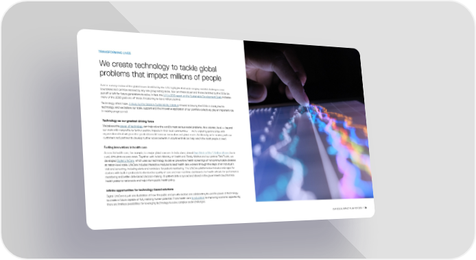 TRANSFORMING LIVES We create technology to tackle global problems that impact millions of people Even a cursory review of the global issues identified by the U.N. highlights that wide-ranging societal challenges cross boundaries and can’t be resolved by any one group acting alone. Nor can these issues and those identified by the SDGs be put off or left for future generations to solve. In fact, the U.N.’s 2018 report on the Sustainable Development Goals indicates many of the 2030 goals are off-track, threatening to leave millions behind. Technology offers hope. A study by the Global e-Sustainability Initiative showed achieving the SDGs is closely tied to technology, and we believe our scale, support and the innovative application of our portfolio collectively play an important role in making progress real. Technology as our greatest driving force We believe the power of technology can help solve the world’s most serious social problems. At a visionary level — beyond our work with nonprofits to further positive impacts in their local communities — we’re exploring partnerships with organizations that will glean the greatest benefit from our innovation and global reach. Additionally, we’re working with our customers and partners to develop further advancements in industries that can help reach the most people in need. Fueling innovations in health care Access to health care, for example, is a major global concern. In India alone, almost two-thirds of the 1.3 billion citizens live in rural, difficult-to-access areas. Together with India’s Ministry of Health and Family Welfare and our partner Tata Trusts, we developed Digital LifeCare, which uses our technology to deliver preventive health screenings of noncommunicable diseases at nation-level scale. LifeCare includes interactive modules to lead health care workers through the steps of an individual’s visit and screening, including alerts and reminders for patient monitoring. The LifeCare platform also includes web apps for doctors with built-in protocols to standardize quality of care and near real-time dashboards for health officials for performance monitoring and better data-based decision-making. All patient data is synced and stored in the government cloud to track health patterns nationwide and help inform public health policy. Infinite opportunities for technology-based solutions Digital LifeCare is just one illustration of how the public and private sectors are collaborating to use the power of technology to create a future capable of fully realizing human potential. From health care to education to improving economic opportunity, there are limitless possibilities for leveraging technology to solve complex social challenges. OUR SOCIAL IMPACT PLAN FOR 2030 / 28