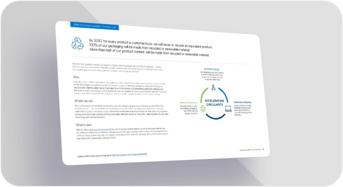 2030 Advancing Sustainability Moonshot Goal By 2030, for every product a customer buys, we will reuse or recycle an equivalent product. 100% of our packaging will be made from recycled or renewable material. More than half of our product content will be made from recycled or renewable material. Since the first industrial revolution, our modern economic model has brought many benefits to humankind — but the Innovative Design time has come for a new direction. Population growth, combined with rising prosperity and ecosystem pressures, mean Our designers start with the end our longtime approach of discarding materials as “waste” is increasingly unsustainable. in mind, making products easy to use, easy to repair and easy Why to recycle when done. Separating value creation from material consumption is a critical step in the transition from a linear to a circular economy. At Dell Technologies, we want to eliminate the concept of waste — rethinking, redesigning, reusing and recycling our way to a safer, healthier, better future. A bold step for us in this direction is to set ambitious goals that challenge us to take back as much as we produce, and to significantly scale our adoption of recycled and renewable materials. These two actions, along with ensuring what we do produce is itself recyclable, form the backbone of the circular economy. Where we are Reuse & Recycling ACCELERATING Sustainable Materials We’re in the process of calculating our baselines, and early estimates suggest we are collecting less than 10% of the Extending lifetimes and CIRCULARITY Using recycled/renewable products we sell — and around 85% of our packaging and less than 5% of our total product materials are currently recovering materials at materials in products and made from recycled or renewable content. While these are estimates that will be refined over time, part of our long-term end of life fuel the packaging keeps those journe circular economy. materials circulating in the y to drive a circular economy will be to build better data tools across our value chain, capturing better life cycle data economy. and driving more informed decisions. What’s next With our many global recycling services and our use of recycled-content plastics, we are on the proper path and we will continue to expand these initiatives. Ultimate success will require ingenuity, further research and development, and continued strong partnerships with our suppliers, academia and the nonprofit community. We’re excited to team up and keep tackling the sustainability challenges ahead. Explore Dell's most recent progress at DellTechnologies.com/ProgressMadeReal OUR SOCIAL IMPACT PLAN FOR 2030 / 12