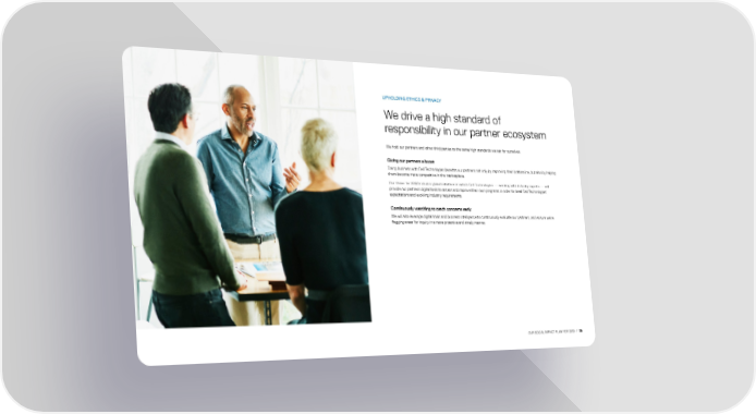 UPHOLDING ETHICS & PRIVACY We drive a high standard of responsibility in our partner ecosystem We hold our partners and other third parties to the same high standards we set for ourselves. Giving our partners a boost Doing business with Dell Technologies benefits our partners not only by improving their bottom line, but also by helping them become more competitive in the marketplace. Our Vision for 2030 includes global initiatives in which Dell Technologies — working with industry experts — will provide our partners digital tools to assess and improve their own programs in order to meet Dell Technologies’ expectations and evolving industry requirements. Continuously watching to catch concerns early We will also leverage digital tools and business intelligence to continuously evaluate our partners, and ensure we’re flagging areas for inquiry in a more proactive and timely manner. OUR SOCIAL IMPACT PLAN FOR 2030 / 39