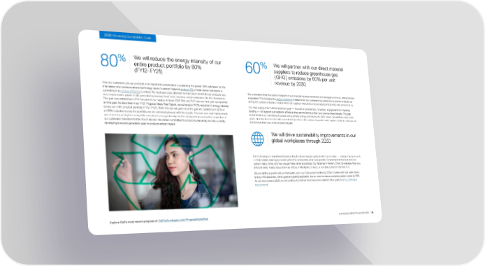 2030 Advancing Sustainability Goals % We will reduce the energy intensity of our % We will partner with our direct material 80 entire product portfolio by 80% 60 suppliers to reduce greenhouse gas (FY12–FY21) (GHG) emissions by 60% per unit revenue by 2030 How our customers use our products is an important consideration in protecting the planet. With estimates for the information and communications technology sector’s carbon footprint at about 2% of total carbon emissions, a commitment to energy efficiency is critical. We must pay close attention to how much electricity our products use, We understand that the carbon footprint of our products must be monitored and managed across our entire business since most electric power is still generated by burning fossil fuels, releasing carbon emissions into the atmosphere. ecosystem. This includes the carbon emissions created when our customers buy electricity to use our products, as This goal was established in FY14 as part of our Legacy of Good 2020 Plan and FY21 was our final year we reported well as the carbon emissions created when our suppliers manufacture key products and provide vital services to us. on this goal. As described in our FY21 Progress Made Real Report, we achieved a 76.7% reduction in energy intensity Our new supply-chain carbon emissions goal — focused on partnership, innovation, engagement and capability across our entire product portfolio (FY12–FY21). While this did not quite meet the goal we established in 2013 of building — will support our suppliers’ efforts as they set and achieve their own science-based targets. This goal an 80% reduction across the portfolio, we are extremely pleased with the results. The year-over-year improvement demonstrates our commitment to addressing climate change and meets the SBTi criteria for ambitious value chain was driven in part by the nearly 10% reduction in energy intensity for the client portfolio and by the completion of goals, meaning we are in line with current best practices. We continue to partner with suppliers on their efforts to set our customers’ transition to the 14G of servers. We remain committed to product sustainability and are currently and achieve their own science-based targets. developing a second generation goal on product carbon impact. We will drive sustainability improvements in our global workplaces through 2030 Dell Technologies’ commitment to protecting the planet may be global, but it is local action — informed by local needs — that creates meaningful results within the communities where we operate. Commitment at the local level can come in many forms, and how we get there varies accordingly. Our factories in Xiamen, China, for example, face very different water-related issues than our offices in Montpellier, France, or our data centers in Durham, N.C. We are setting a goal to reduce freshwater use in our Dell-owned facilities by 25% in locales with high water stress and by 10% elsewhere. Other goals are globally applicable, like our work to reduce workplace plastic waste by 90%. As we move toward 2030, we will continue to monitor local issues and establish other goals to drive continuous improvement. Explore Dell's most recent progress at DellTechnologies.com/ProgressMadeReal OUR SOCIAL IMPACT PLAN FOR 2030 / 15