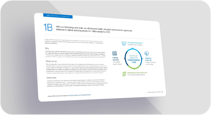 2030 Transforming Lives Moonshot Goal With our technology and scale, we will advance health, education and economic opportunity 1B initiatives to deliver enduring results for 1 billion people by 2030 In today’s digital economy, access to technology is more essential than ever to addressing the world’s most pressing societal Connecting with partners challenges. As a global tech leader, Dell Technologies will play a key role in solving the world’s challenges — a responsibility we to combine our strengths embrace wholeheartedly. Why We are technology optimists. We believe technology does and will dramatically improve lives, but it’s up to us to ensure it reflects our humanity and values. The next few decades will offer exponential progress, but everyone must be included in this digital era. OUR FOCUS If we don’t act on a global scale, then we will miss the opportunity to apply technology in the most meaningful ways — providing individualized health care, giving access to STEM-related education, and helping people build their skills, careers and businesses. Enabling AREAS FOR Advancing education TRANSFORMING health care Where we are with greater LIVES through the power With technology skills in urgent demand around the globe, Dell Technologies brings STEM education to underserved children digital inclusion of technology worldwide through a broad array of programs. We have helped 16 million people, directly and indirectly, through our Youth Learning initiatives (based on FY19 data), and are well on our way to reaching millions more through strategic partnerships. Working with the Ethiopian Ministry for Education, for example, we’re equipping over 1,000 schools with more than 24,000 Dell computers, while our nonprofit parner Camara Education offers information and communications technology training for school leaders and teachers. Together, we will provide the power of technology to over a million students who lack tech access at school and at home. Expanding economic opportunity by increasing equitable access What’s next To achieve our 2030 vision, we’re evolving our social impact execution strategy. For example, we’re moving from traditional philanthropy to a collaborative model — addressing systemic, global challenges by joining forces with customers and other companies on targeted, region-specific goals. This effort is currently focused on increasing the reach and effectiveness of STEM education for underrepresented U.S. high schoolers, and will expand internationally, focusing on other regional challenges. Explore Dell's most recent progress at DellTechnologies.com/ProgressMadeReal OUR SOCIAL IMPACT PLAN FOR 2030 / 29