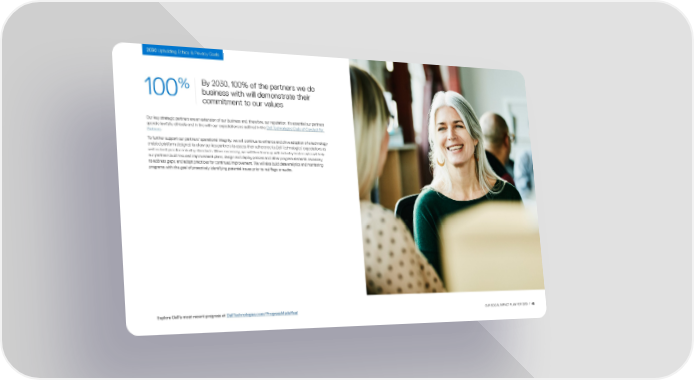 2030 Upholding Ethics & Privacy Goals % By 2030, 100% of the partners we do 100 business with will demonstrate their commitment to our values Our key strategic partners are an extension of our business and, therefore, our reputation. It’s essential our partners operate lawfully, ethically and in line with our expectations as outlined in the Dell Technologies Code of Conduct for Partners. To further support our partners’ operational integrity, we will continue to enhance and drive adoption of a technology- enabled platform designed to allow our key partners to assess their adherence to Dell Technologies’ expectations as well as best practice industry standards. When necessary, we will then team up with industry leaders who will help our partners build focused improvement plans, design and deploy policies and other program elements necessary to address gaps, and adopt practices for continued improvement. We will also build data analytics and monitoring programs with the goal of proactively identifying potential issues prior to red flags or audits. Explore Dell's most recent progress at DellTechnologies.com/ProgressMadeReal OUR SOCIAL IMPACT PLAN FOR 2030 / 40